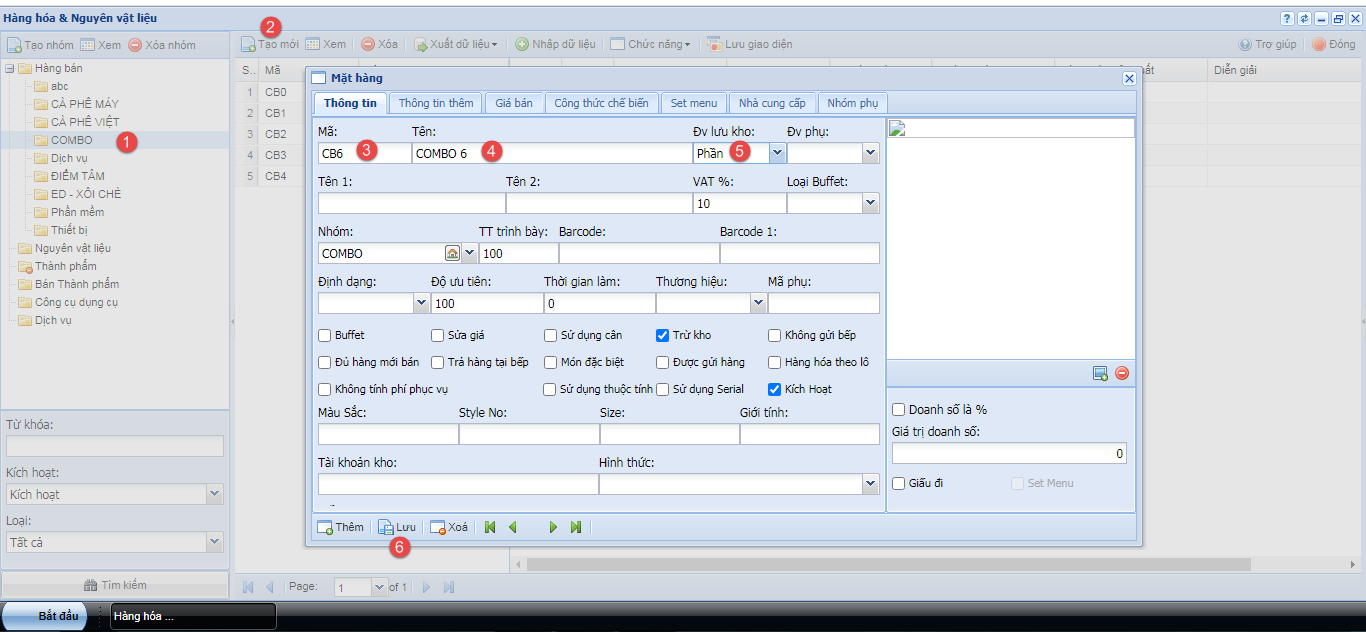- Bước 2: Vào nhóm COMBO (1) => Tạo mới (2) => Điền mã, tên món, đơn vị tính (3 => 5) => Bấm Lưu để hoàn thành thao tác (6).