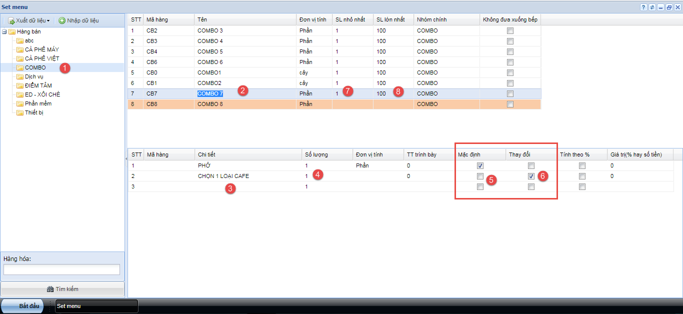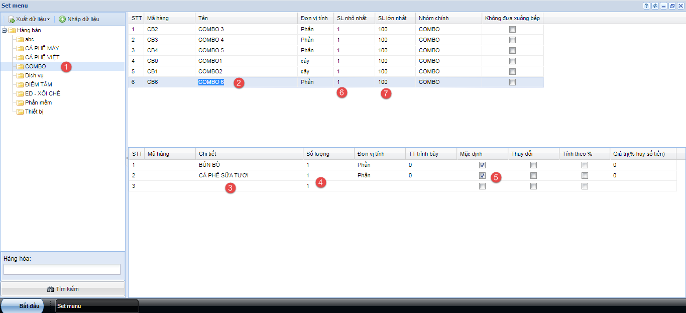 - Bước 3: Danh mục => Cài đặt cho bán hàng => Set menu => Chọn vào nhóm COMBO (1) => Nhấp vao món cần tạo (2) => Sau đó xuống phần chi tiết để tạo chi tiết món cho combo (3) => Nhập số lượng (4) => Chọn vào Mặc định (5) => Sau đó thiết lập SL nhỏ nhất và SL lớn nhất (6&7) đây là số lượng ít nhất và nhiều nhất cho 1 lần order => Sau cùng các bạn nhấp qua dòng khác với dòng đang chọn để lưu thao tác.
