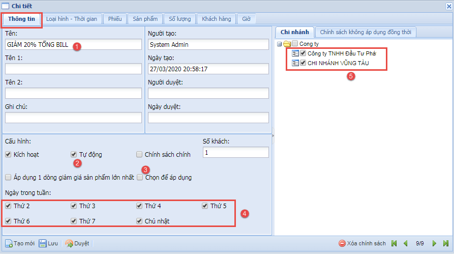 - Bước 3: Tại tab "Thông tin" đánh tên chính sách (1), chọn vào nút "Tự động" khi muốn chính sách được áp dụng tự động (2), chọn nút "Chọn để áp dụng" khi không muốn tự động (3), chọn ngày để áp dụng (4), chọn chi nhánh áp dụng (5).