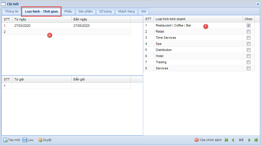 - Bước 4: Tại Tab "Loại hình - Thời gian" chọn thời gian áp dụng (6) và loại hình kinh doanh (7).