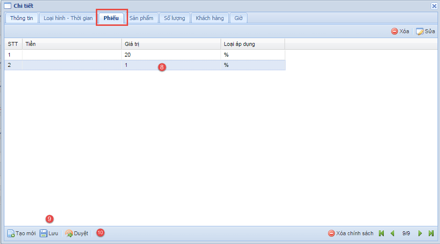 - Bước 5: Tại Tab "Phiếu" bạn đánh tỷ lệ % muốn giảm (8), sau đó nhấn nút Lưu (9), cuối cùng nhấn nút Duyệt (9) để hoàn thành.