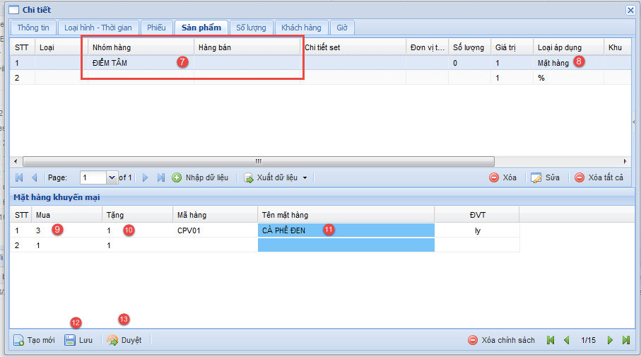 - Bước 5: Tại Tab “Sản phẩm” bạn chọn mặt hàng cần khuyến mãi tại cột Hàng bán (7), chọn hình thức là Mặt hàng (8). Bạn có thể chọn khu nếu chính sách có quy định. Tại phần “Mặt hàng khuyến mãi” bạn nhập số lượng mua (9), số lượng khuyễn mãi (10) và mặt hàng được khuyến mãi (11). Sau đó bạn chọn “Lưu” (12) và “Duyệt” (13) để hoàn thành cài đặt.