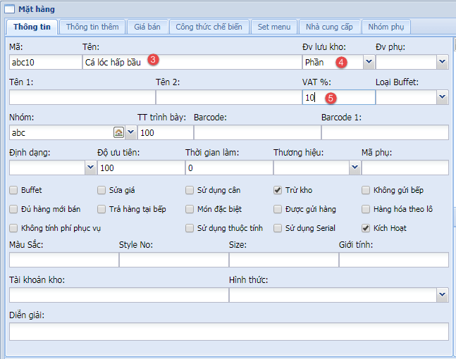 - Bước 3: Tại tab "Mặt hàng" đánh tên món (3), đơn vị tính (4) và % VAT (5) sau đó bấm nút lưu