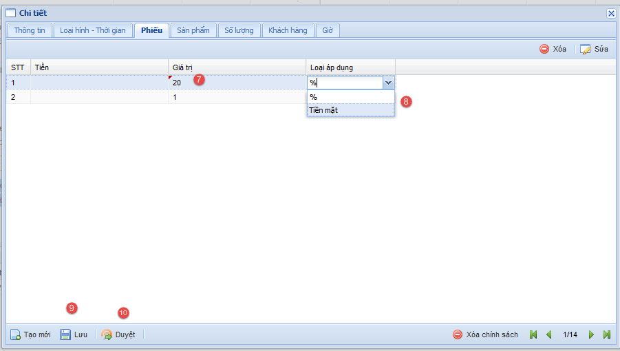 - Bước 5: Tại Tab “Phiếu” bạn nhập giá trị cần giảm (7), chọn hình thức là % hoặc tiền mặt (8). Sau đó bạn chọn “Lưu” (9) và “Duyệt” (10) để hoàn thành cài đặt