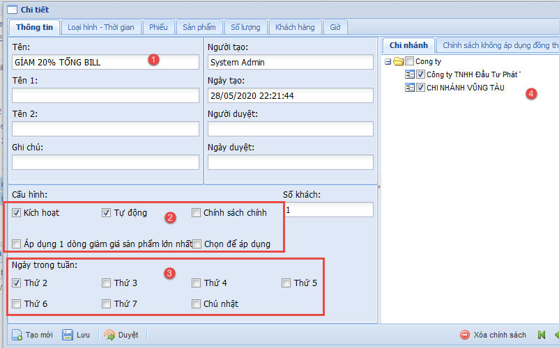 - Bước 3: Tại Tab “Thông tin” bạn điền tên chính sách (1), chọn nút “Tự động” hoặc “Chọn để áp dụng” (2), chọn các ngày để áp dụng (3), chọn chi nhánh được áp dụng (4)
