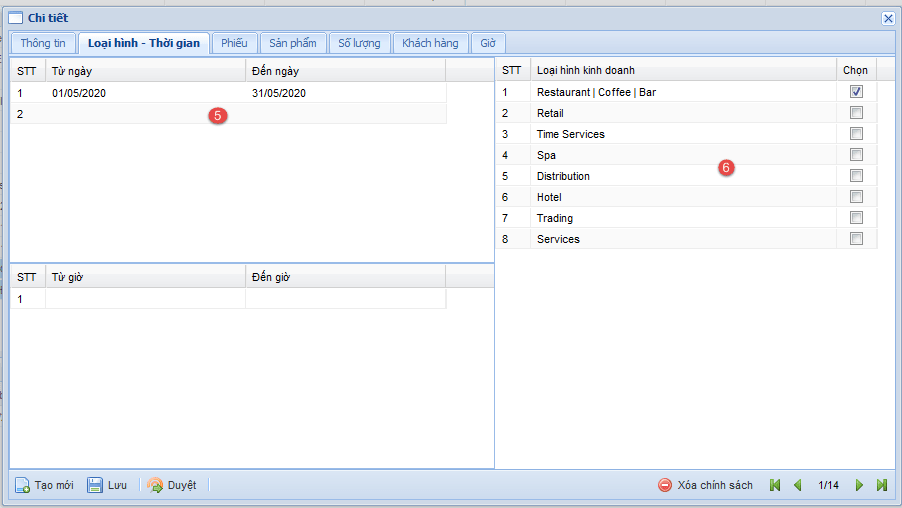 - Bước 4: Tại Tab “Loại hình và thời gian” bạn chọn khoảng thời gian áp dụng từ ngày nào (5) bạn có thể cài đặt thêm giờ áp dụng bên dưới. Chọn loại hình kinh doanh của tổ chức bạn (6).