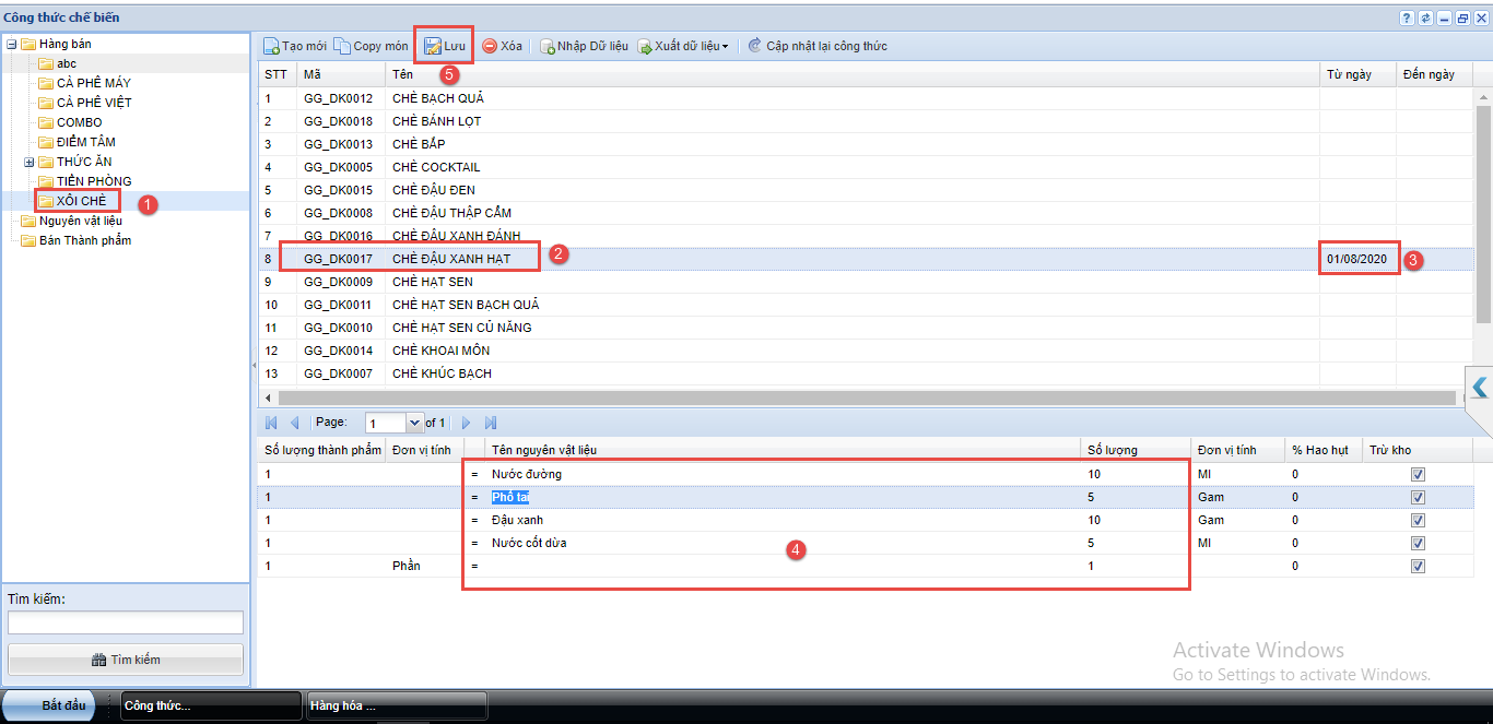 Bước 2: Chọn vào nhóm và món cần tạo công thức (1) & (2), chọn ngày bắt đầu áp dụng (3), chọn vào nguyên vật liệu (4) và bấm nào nút Lưu để hoàn thành thao tác (5).