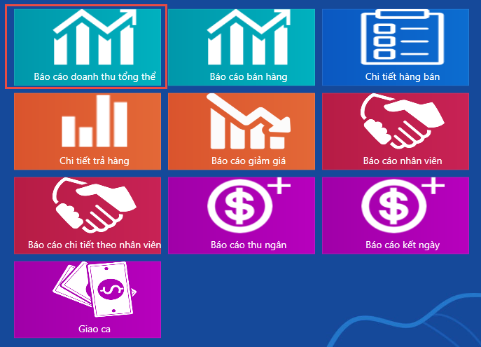 - Bước 2: Sau đó chọn loại báo cáo cần xem, có rất nhiều loại báo cáo nhưng thông thường ta sẽ sử dụng loại báo cáo chính là : Báo cáo doanh thu tổng thể để lấy số liệu bán hàng đầy đủ và tổng quát nhất.