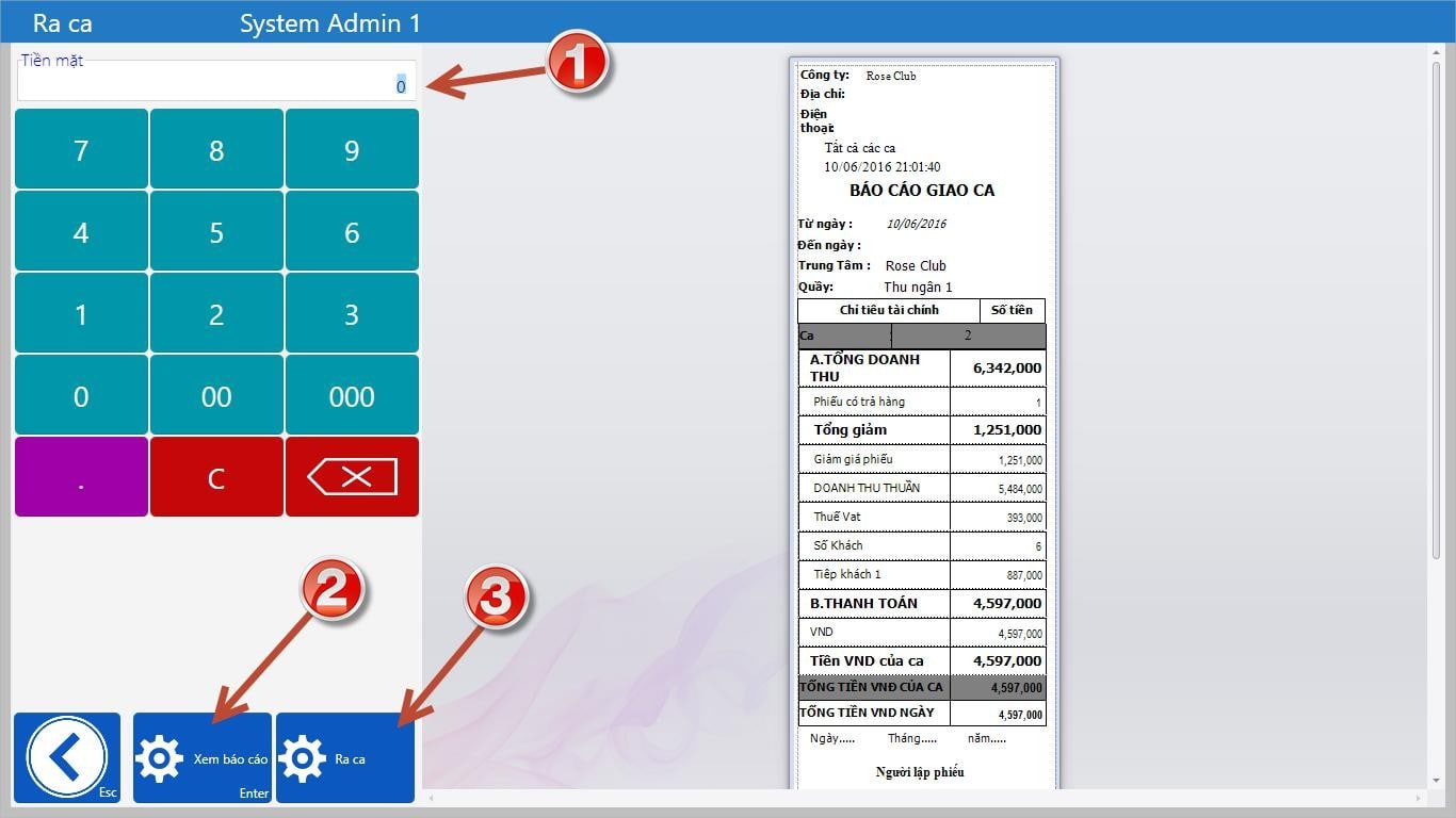 3. Bấm nút RA CA để kết thúc ca và in báo cáo.