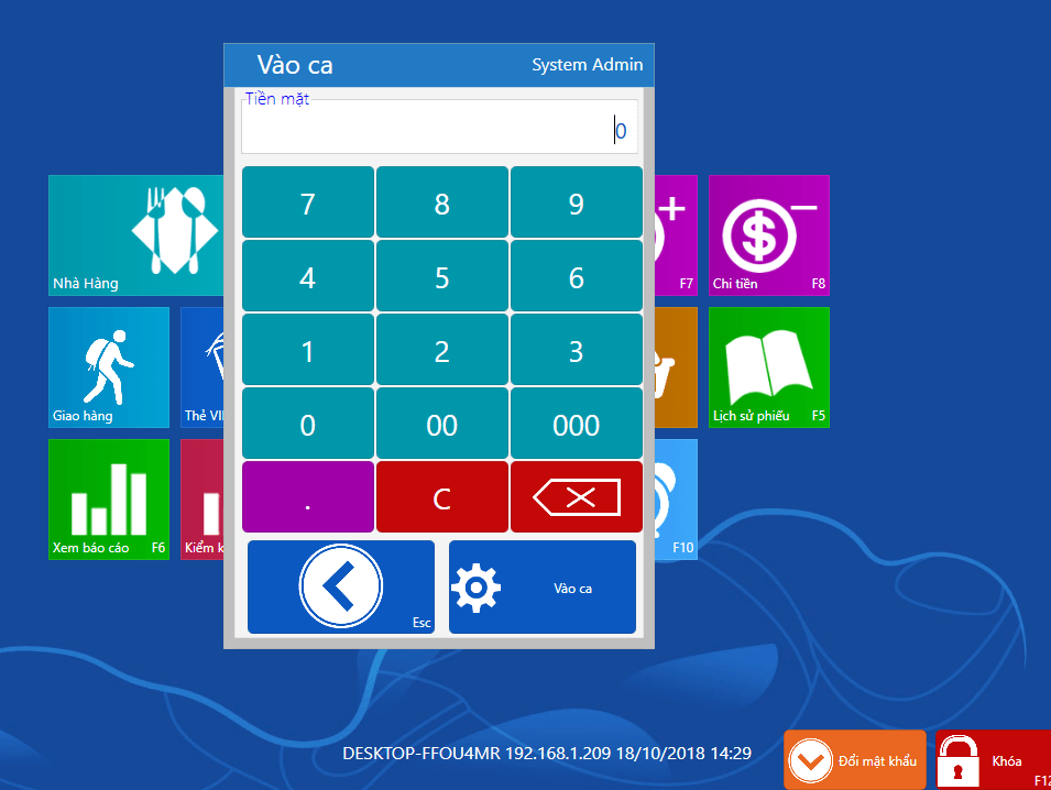 Khi chọn nút Nhà Hàng giao diện vào ca sẽ tự động mở lên. Bạn khai báo số tiền mặt hiện có ở quầy (nếu có) số liệu này dùng để so sánh số tiền hiện có ở các ca làm việc.