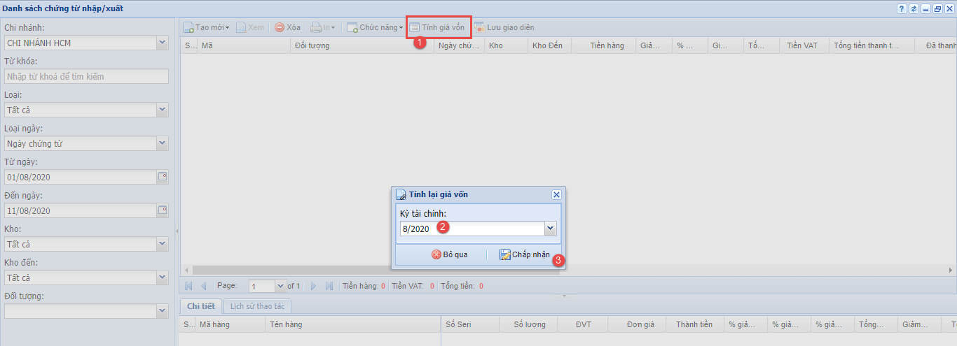 Bước 2: Bạn chọn vào nút Tính giá vốn (1), chổ ô Kỳ tài chính bạn chọn tháng cần tính (2) sau đó bấm nút Chấp nhận để hệ thống thực hiện việc tính giá (3)