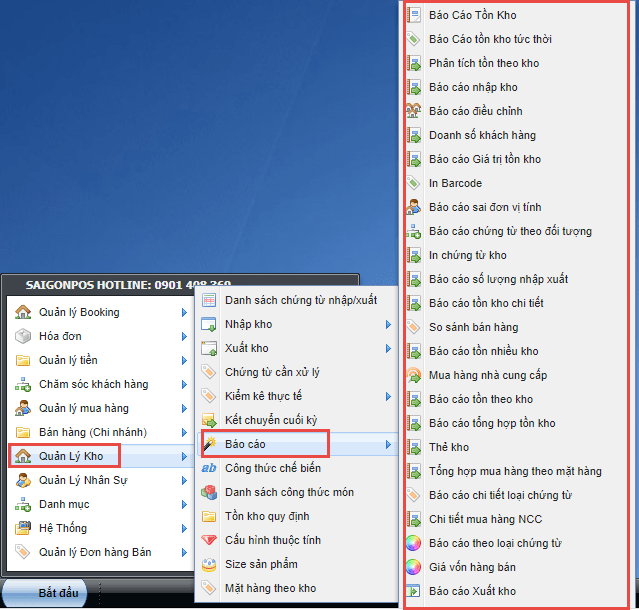 Bắt đầu => Quản lý kho => Báo cáo => Chọn 1 trong những báo cáo cần lấy số liệu